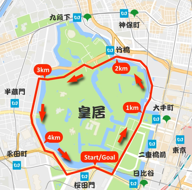 - 皇居外堀周辺のコース:5km程度の Flatなコースで、皇居の外堀を周回しながら都会の景色を楽しみます。